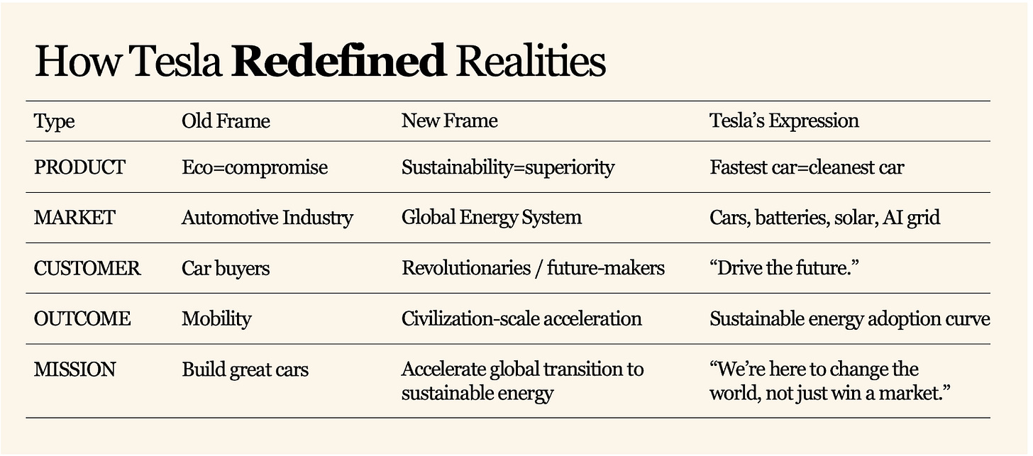 Breakthrough startups don’t just improve what exists — they install a new kernel of belief that changes how people see reality. Every market runs on hidden assumptions. When you find them, refuse them, and replace them, your new kernel rewires the system around your logic. You can reframe through your product, market, customer, outcome, or mission. The best founders often reframe at multiple levels simultaneously, as demonstrated by Tesla in the chart below: