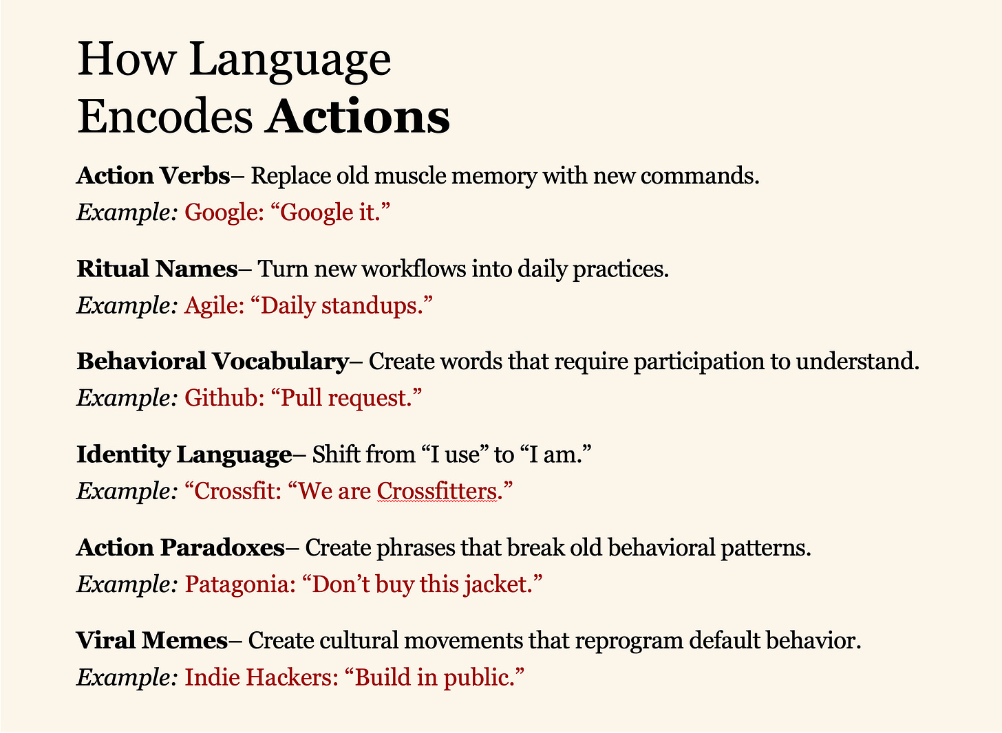 The best founders know that language works like software for human minds. When someone adopts your vocabulary, they’re installing your beliefs. When they use your phrases, they’re running your assumptions. When your language becomes their language, your beliefs shape their reality.
